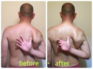 右は2cmほどの変化ですが、動きの悪かった左は5cmほど後ろに手を回した時に手が上に上がる様になりました。