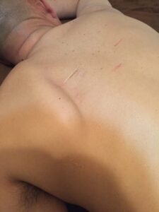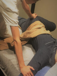 治療は身体全体の歪みを取るマッサージ、整体を施し肩甲下筋の緊張を取るために局所にハリを刺入。